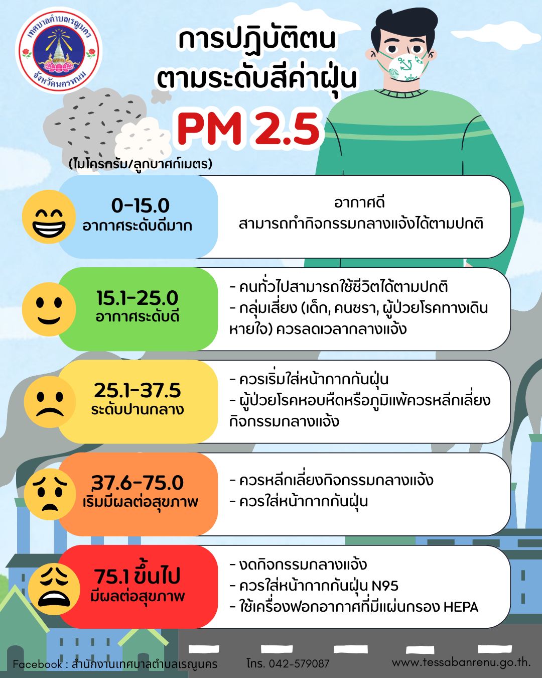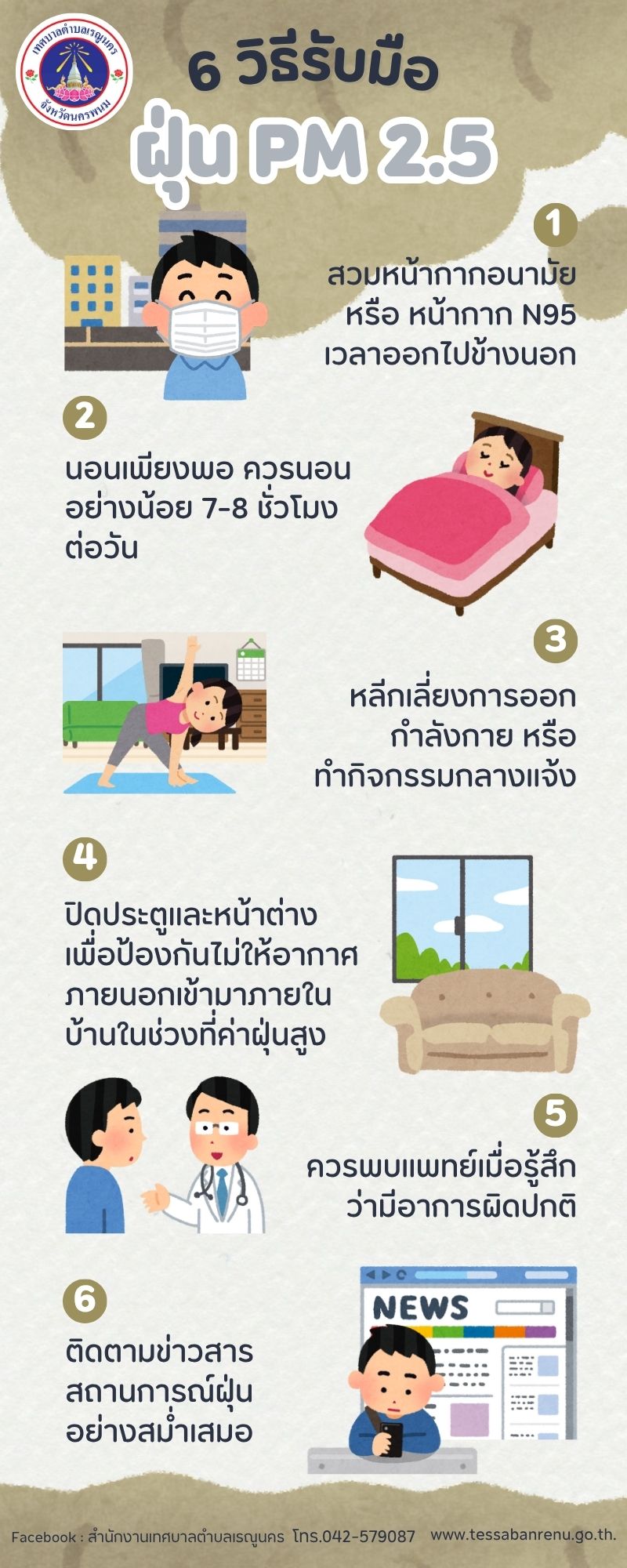 เทศบาลตำบลเรณูนคร ประชาสัมพันธ์รู้ทัน รับมือฝุ่นละอองขนาดเล็ก PM 2.5 PM 2.5 หรือฝุ่นละอองขนาดไม่เกิน 2.5 ไมครอน เป็นภัยคุกคามต่อสุขภาพ หากได้รับเข้าสู่ร่างกายจะทำให้มีความเสี่ยงต่อสุขภาพ โดยในระยะสั้น ทำให้เกิดอาการ ไอ จาม ระคายเคืองผิวหนัง ผื่น คัน ระคายเคืองตา แสบตา ตาแดง และในระยะยาวสามารถส่งผลต่อระบบทางเดินหายใจ ระบบหัวใจและหลอดเลือด เพิ่มความเสี่ยงต่อโรคเบาหวาน อาจทำให้คลอดก่อนกำหนด ทารกแรกคลอดมีน้ำหนักต่ำ หรือผิดปกติ แท้งแห้ง อาจรุนแรงถึงขั้นเป็นมะเร็งปอดได้