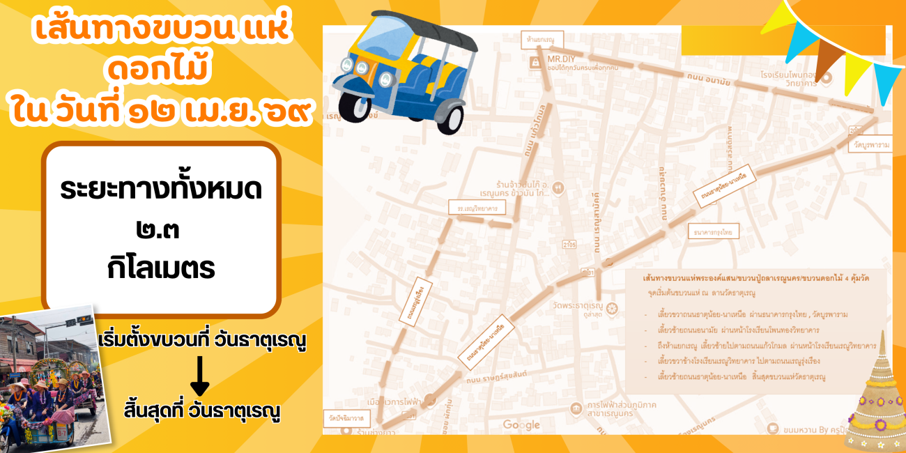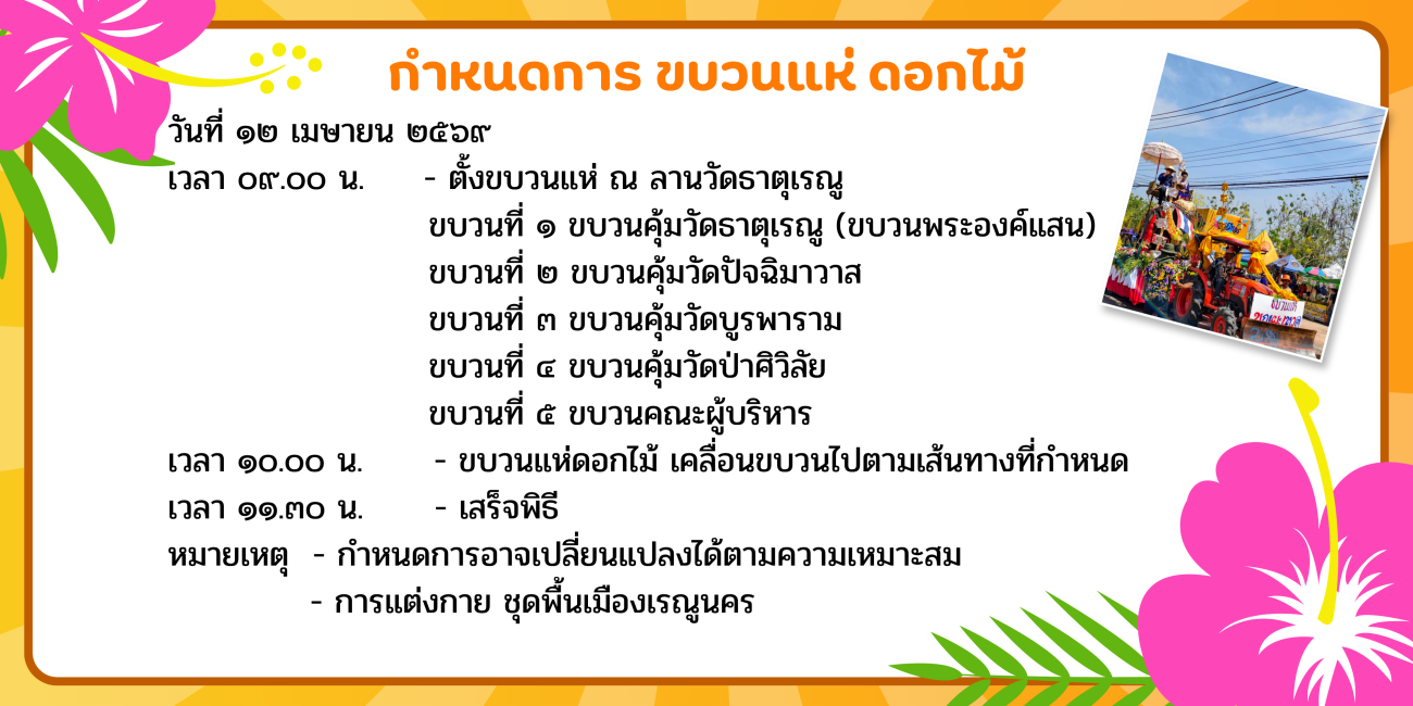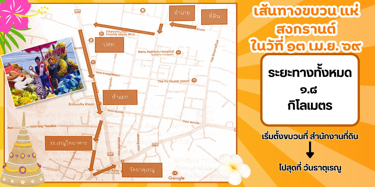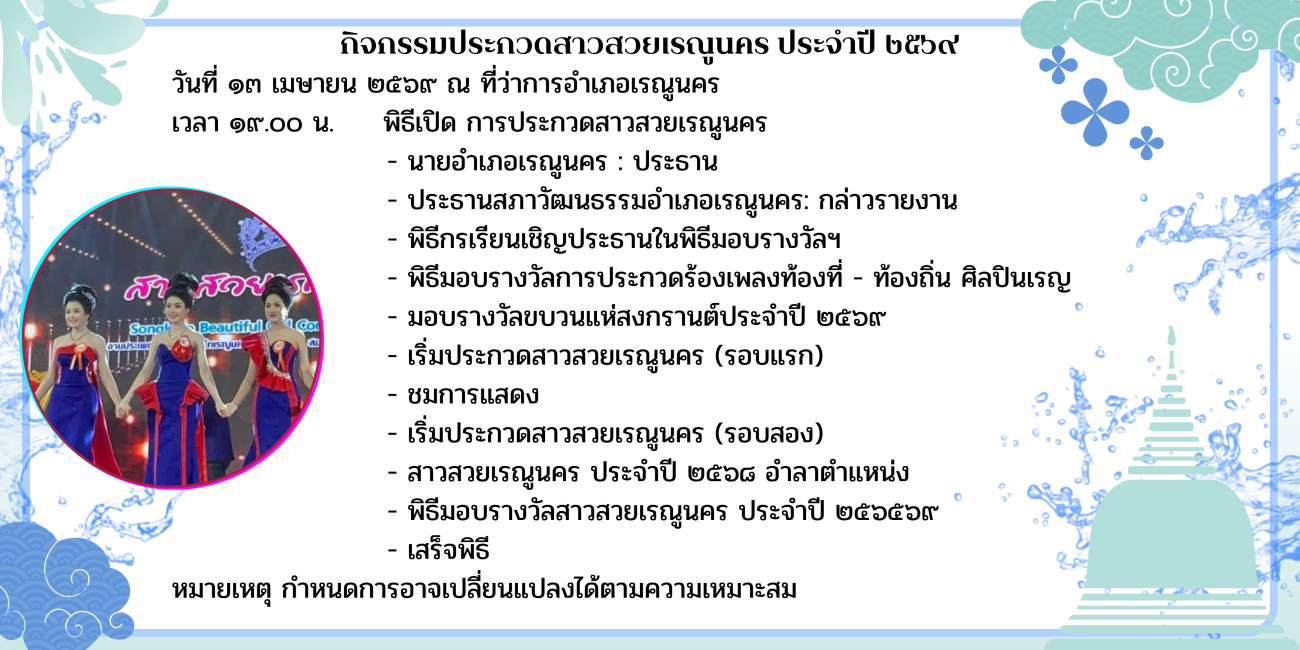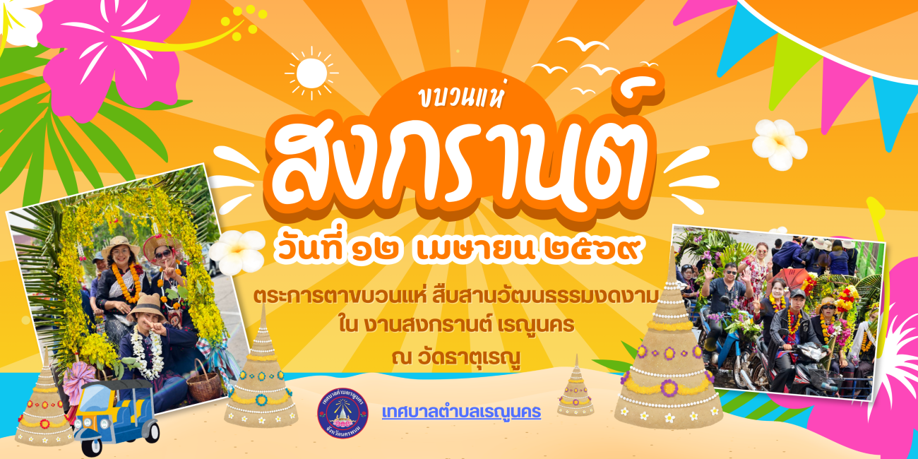 หลบมาเด้อ มายามบ้าน หลบมาดิ้นสงกรานต์บ้านเฮา สงกรานต์อยู่เรณูนครบ้านเฮา โม้นแถะใด๋ผิน้อง12 - 13 เมษายน 2569 สาดความสุขรับปีใหม่ไทย สืบสานประเพณี ทำบุญตักบาตร รดน้ำดำหัวผู้สูงอายุ สรงน้ำพระองค์แสน คู่บ้านคู่เมืองชาวเรณูนคร