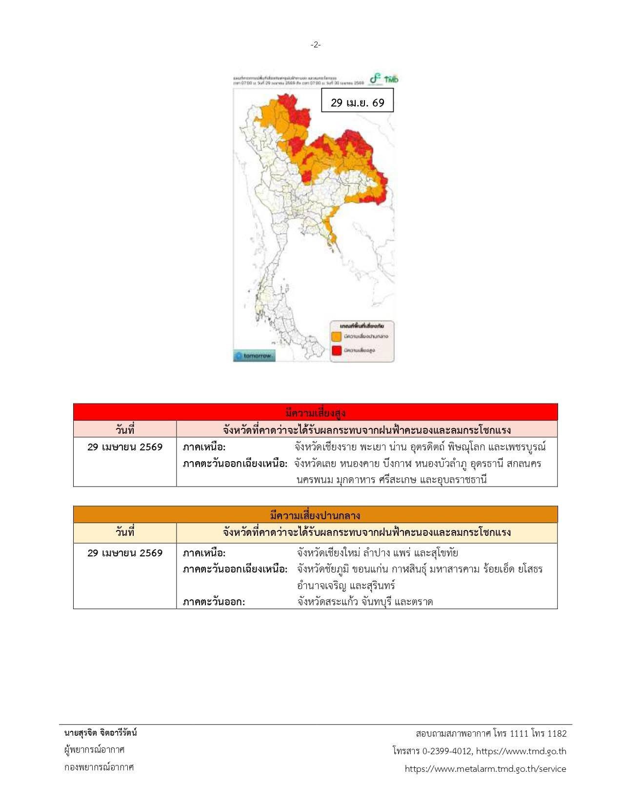 #ประกาศกรมอุตุนิยมวิทยา เรื่อง #พายุฤดูร้อนบริเวณประเทศไทยตอนบน (มีผลกระทบตั้งแต่วันที่ 29 เมษายน – 1 พฤษภาคม 2569) #ฉบับที่1 (41/2569) ------------------------ ในช่วงวันที่ 29 เม.ย. – 1 พ.ค. 69 ประเทศไทยตอนบนจะมีพายุฤดูร้อนเกิดขึ้น โดยมีลักษณะของพายุฝนฟ้าคะนองลมกระโชกแรง ลูกเห็บตก และฝนตกหนักบางแห่ง รวมถึงอาจมีฟ้าผ่าเกิดขึ้นได้บางพื้นที่ โดยจะเริ่มจากภาคเหนือ ภาคตะวันออกเฉียงเหนือ และภาคตะวันออกก่อน ส่วนภาคกลาง รวมทั้งกรุงเทพมหานครและปริมณฑล จะได้รับผลกระทบในระยะถัดไป เนื่องจากบริเวณความกดอากาศสูงหรือมวลอากาศเย็นจากประเทศจีนจะแผ่ลงมาปกคลุมภาคตะวันออกเฉียงเหนือและทะเลจีนใต้ ในขณะที่ประเทศไทยตอนบนมีอากาศร้อนถึงร้อนจัด ขอให้ประชาชนในบริเวณดังกล่าวระวังอันตรายจากพายุฤดูร้อน โดยหลีกเลี่ยงการอยู่ในที่โล่งแจ้ง ใต้ต้นไม้ใหญ่ สิ่งปลูกสร้าง และป้ายโฆษณาที่ไม่แข็งแรง สำหรับเกษตรกรควรเสริมความแข็งแรงให้ไม้ผล และเตรียมการป้องกันความเสียหายที่อาจเกิดขึ้นกับผลผลิต ทางการเกษตรและสัตว์เลี้ยง รวมทั้งดูแลรักษาสุขภาพในช่วงที่สภาพอากาศเปลี่ยนแปลงไว้ด้วย จึงขอให้ประชาชนติดตามประกาศจากกรมอุตุนิยมวิทยา และสามารถติดตามข้อมูลที่เว็บไซต์กรมอุตุนิยมวิทยา http://www.tmd.go.th หรือที่ 0-2399-4012-13 และ 1182 ได้ตลอด 24 ชั่วโมง ประกาศ ณ วันที่ 27 เมษายน พ.ศ. 2569 เวลา 17.00 น. กรมอุตุนิยมวิทยาจะออกประกาศฉบับต่อไปในวันที่ 28 เมษายน พ.ศ. 2569 เวลา 05.00 น.