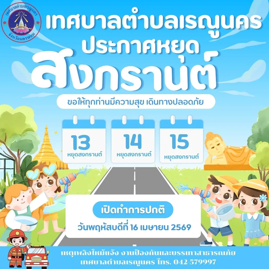 หลบมาเด้อ มายามบ้าน หลบมาดิ้นสงกรานต์บ้านเฮา สงกรานต์อยู่เรณูนครบ้านเฮา โม้นแถะใด๋ผิน้อง12 - 13 เมษายน 2569 สาดความสุขรับปีใหม่ไทย สืบสานประเพณี ทำบุญตักบาตร รดน้ำดำหัวผู้สูงอายุ สรงน้ำพระองค์แสน คู่บ้านคู่เมืองชาวเรณูนคร