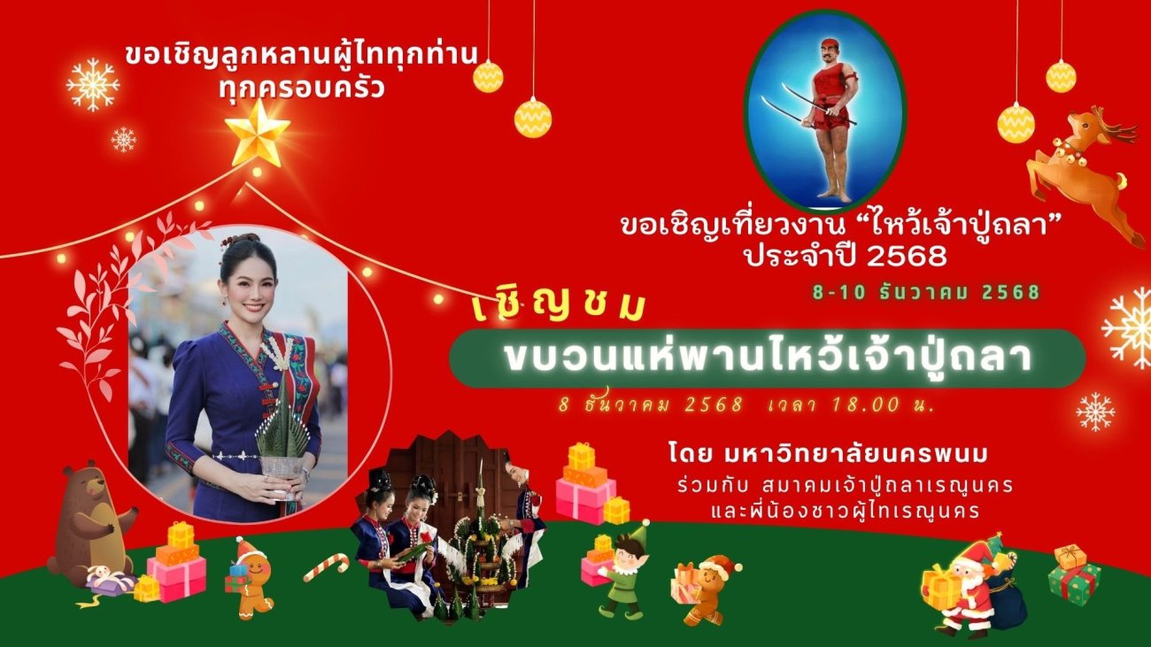 ขอเชิญชวนพ่อแม่พี่น้องชาวอำเภอเรณูนคร และนักท่องเที่ยว ร่วมงานไหว้เจ้าปู่ถลา ระหว่างวันที่ 8-10 ธันวาคม 2568 พบกับการแสดงมหรสพครบงันตลอดคืน ณ หอโหลงเจ้าปู่ถลา อ.เรณูนคร จ.นครพนม