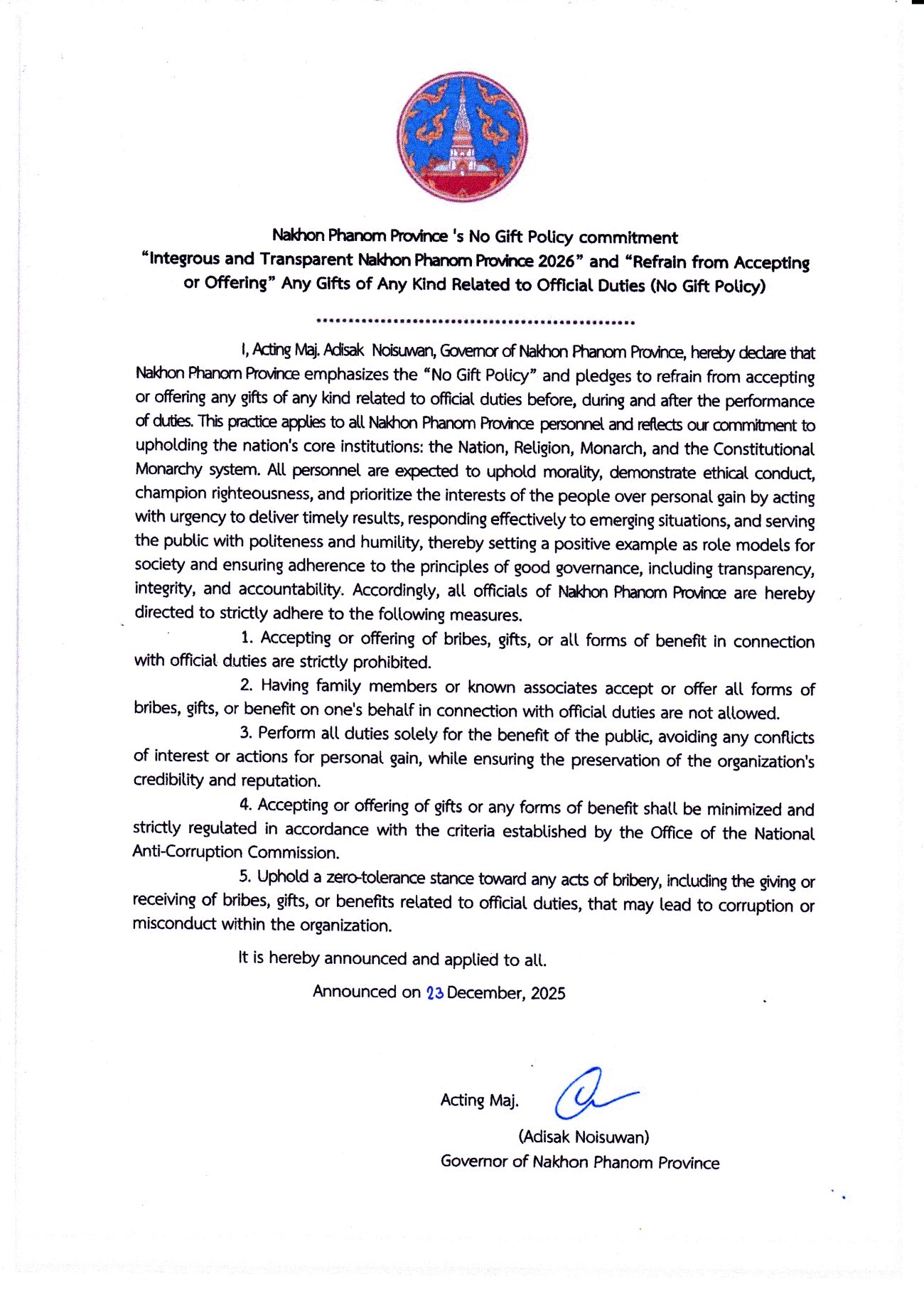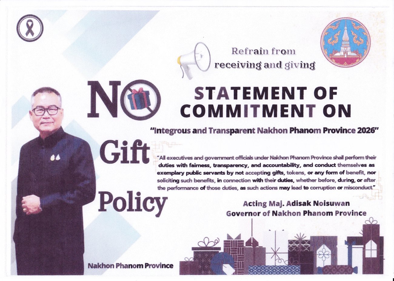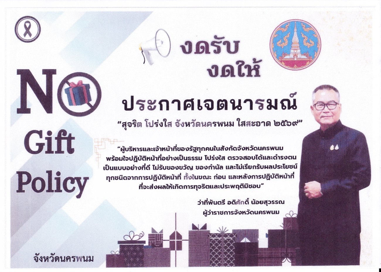 ประกาศเจตนารมณ์ เรื่อง สุจริต โปร่งใส จังหวัดนครพนม ใสสะอาด 2569 และงดรับ งดให้ ของขวัญ ของกำนัลทุกชนิดจากการปฏิบัติหน้าที่ (No Gift Policy)