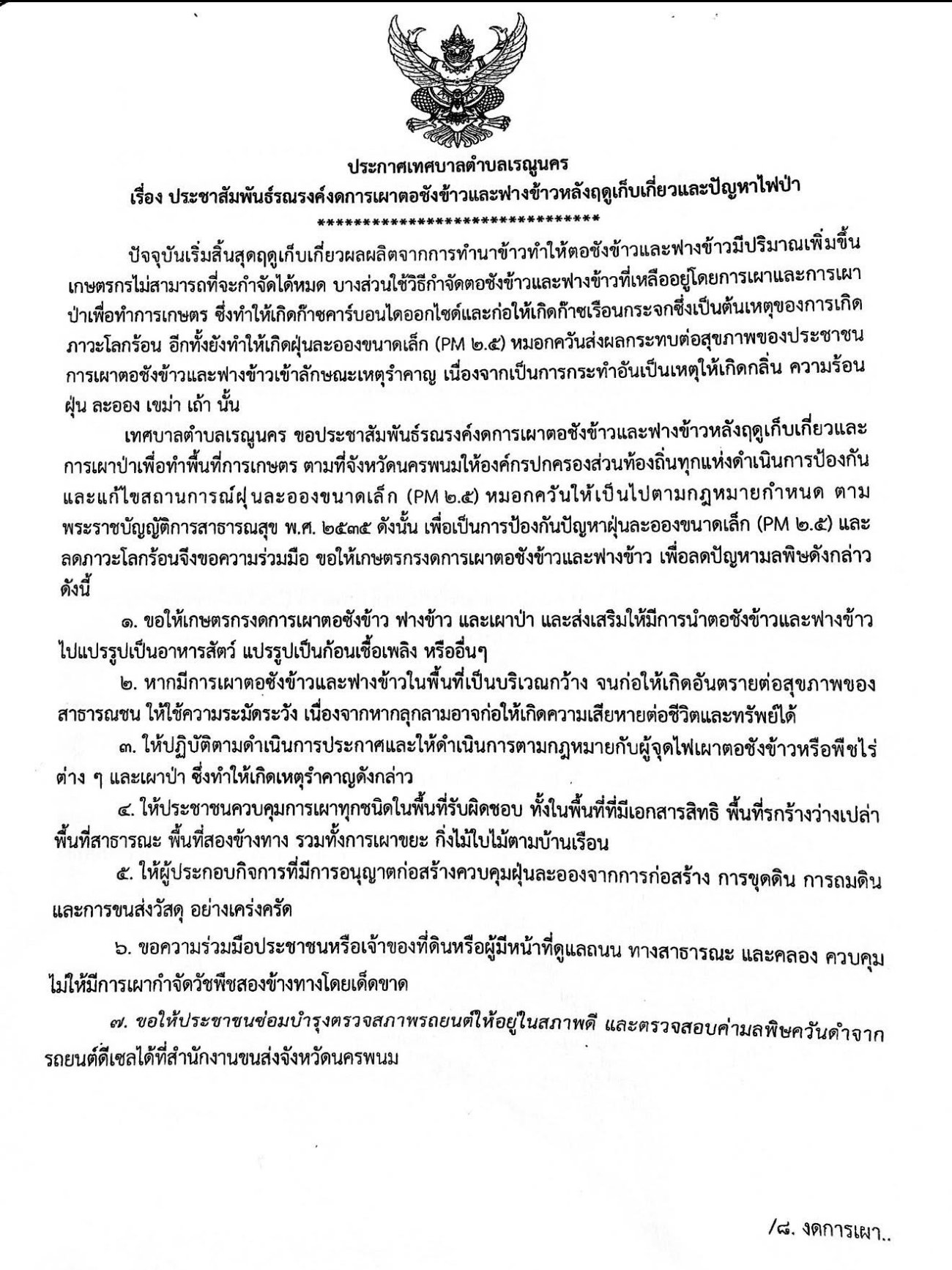 ประกาศเทศบาลตำบลเรณูนคร เรื่อง ประชาสัมพันธ์รณรงค์งดการเผาตอซังข้าวและฟางข้าวหลังฤดูเก็บเกี่ยวและปัญหาไฟป่า
